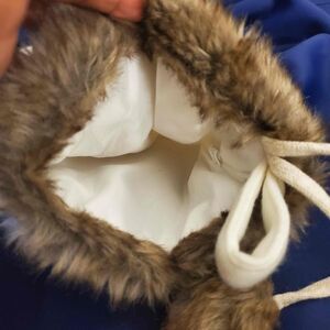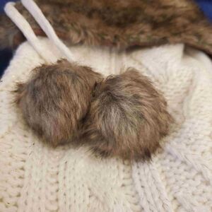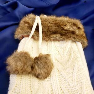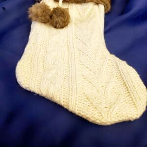 Cram color knitted Christmas Stocking with brown fluffy accents. Pre-owned in good condition. Please refer to pictures for best description,condition verification and measurements.