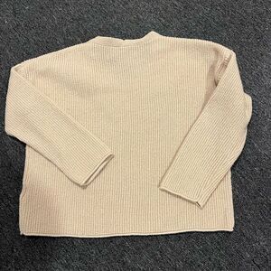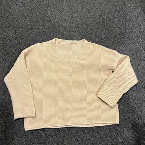 This cream V-neck sweater features a relaxed fit and a minimal design, making it a versatile addition to any wardrobe. Crafted from a medium-weight knit, it offers comfort and style for everyday wear.