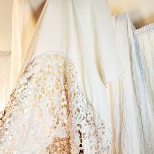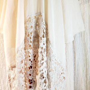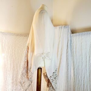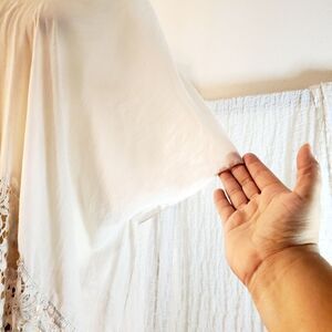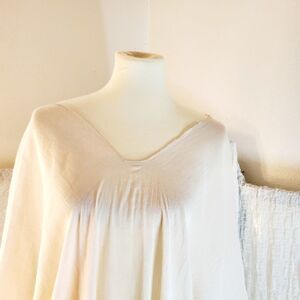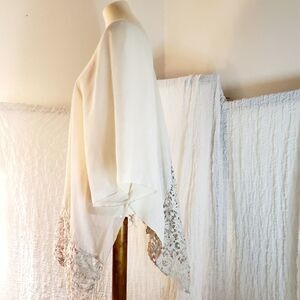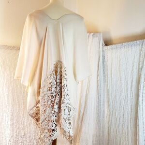 Cream color swim cover up. Poncho style cover with lace like appliques. 30% Cotton and 70% Viscose. Has some imperfections as pictured under the armpit area not noticeable. No size available best guess it can fit up to a size XL. Pre-owned. Please refer to pictures and measurements for best description, condition verification, and fit.