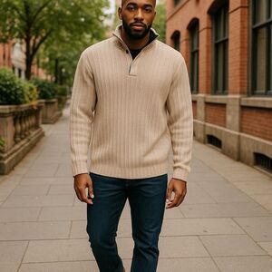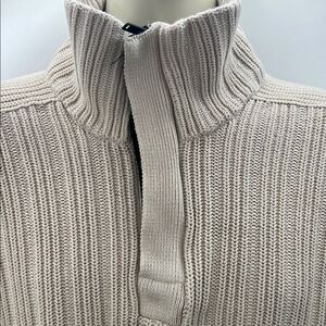 This cream zip-up sweater showcases a classic ribbed knit pattern, offering a timeless and versatile style. The mock neck design with a convenient zipper ensures warmth and comfort, making it ideal for chilly days. Crafted from a thick, cozy material, this sweater is perfect for layering and complements any wardrobe effortlessly.