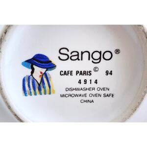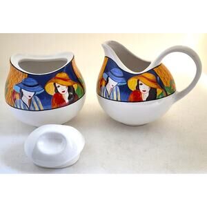 Nice creamer and sugar bowl set. This set is by Sango. It is from the "Cafe Paris" collection. They are white with a colorful design around each one. They have the same design of woman at a Paris cafe. The creamer holds 1.5 cups of fluid. It has a large handle for easy pouring. This is a set of 3 pieces, including the sugar bowl lid.