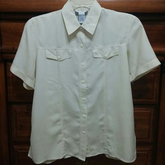 Super silky soft 100% Silk blouse. Is creamy light color, short sleeves, 2 fake pocket flaps with button in front & has a slit on each side on bottom. Back has a seam going across shoulders & 2 seams going down makes blouse look more designed & flatters your body rather than a boxy look. Size L $8.