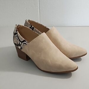 Creamy Tan and Black Mules with Snake Print Accents Zip Back 2" Heel Shoes