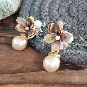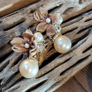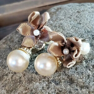 Creamy White Faux Pearl Baubles Clear Austrian Crystal Taupe Satin Bow Earrings