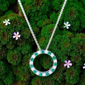 Created Opal and Created Emerald Circle Pendant Necklace in solid 925 Sterling Silver. Necklace is sterling silver and 18 inches in length with a lobster clasp.