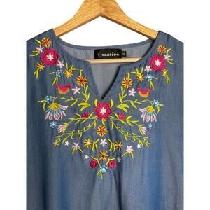 Color/Details: Beautiful blue top with vibrant floral embroidery at neckline, tie detail at sleeves.