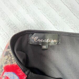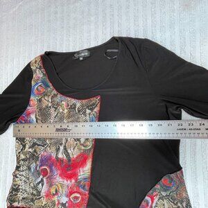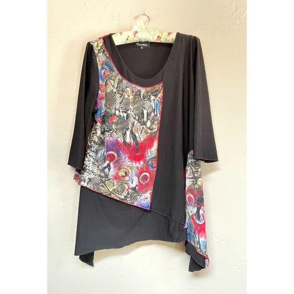 Creation Womens 3/4 Sleeve Tunic Top XXL Red Peacock Feathers Asymmetric Hem
