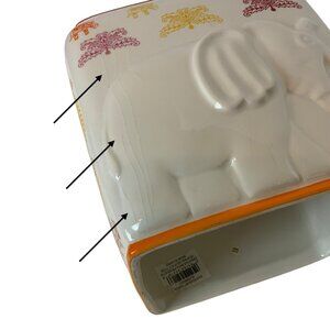 Good pre-owned condition overall, but there are several hairline cracks beneath the glaze on the "elephant" embossed side. Please see photos.