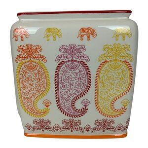 A refined ceramic tissue box cover featuring intricate Indian-inspired elephant and paisley motifs in warm orange, yellow, and burgundy tones.