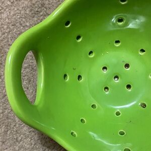 Vibrant green ceramic colander with handle. Perfect for rinsing fruits and vegetables.