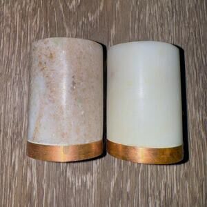 Gorgeous heavyweight stone salt and pepper set with rose gold base.