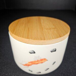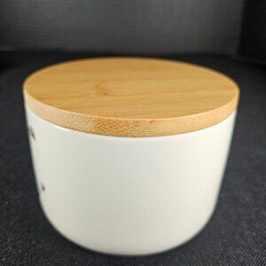 A creative Co-op stoneware snowman canister with bamboo lid. 3.5 Inches tall round. The unique face on this canister sets it apart and will set perfectly into a winter or Christmas theme. A carrot nose and coal eyes and smile is all it takes to let you know that snow is your friend. Canister stoneware and bamboo dimensions 3.5 inches tall by 4.75 inches in diameter. This circular canister features an airtight circular lid. Condition Is excellent pre-owned. Non-smoking pet free home.