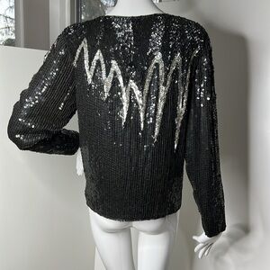 This is a beautiful Creative Creations Sz S Black Silver Beaded Pull On V Neck Blouse. Some of the beads are missing but not noticeable. Fully lined. No odors. No stains.