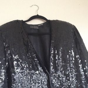 100% silk. Made in India. Black sequins. In mint condition, probably originally from the 80's. Only flaw is a patch of 3 sequins missing on the back. Has shoulder pads. Beaded around seams. Hook front closure. Says Medium. Will fit large with a more fitted look. Get this designer look for less!
