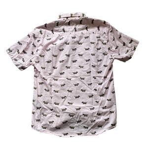 Creative Destruction Pink Short Sleeve Button Down Shirt with Cute Dachshund Hot dogs print and Surf boards