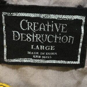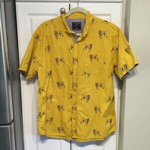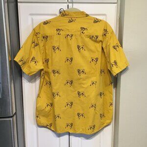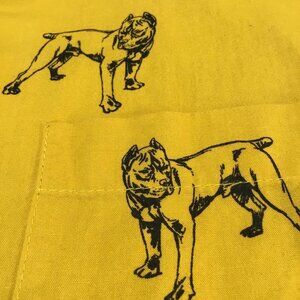Creative Destruction mustard button up shirt with pit bull graphics. Size Large. 100% cotton. Measures 23" across chest and 30" long. GUC.