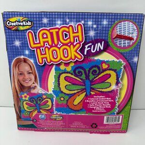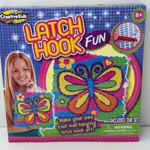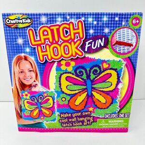 Creative Kids Latch Hook Fun kit lets kids make their own colorful butterfly latch hook wall hanging. Includes yarn, latch hook tool, wood rod, and instructions. Perfect girl gift.