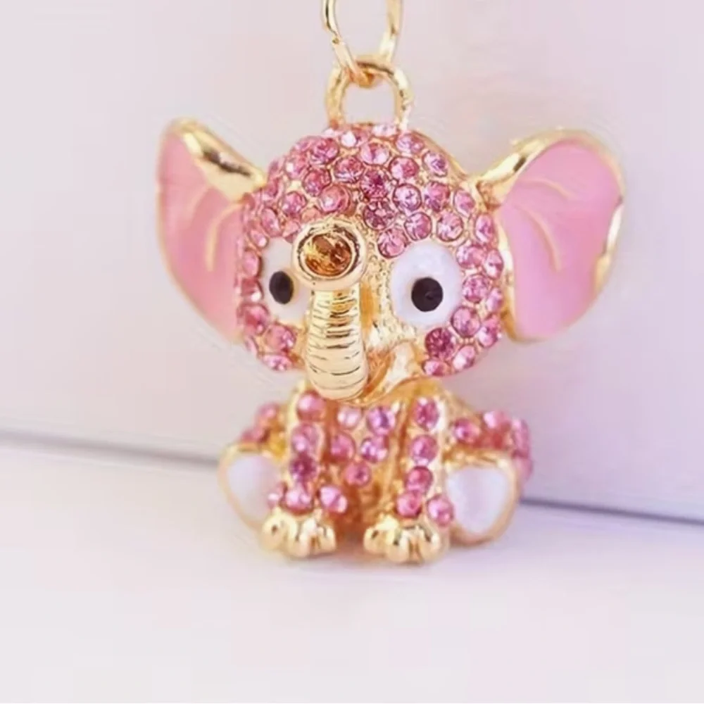 Adorable elephant keychain adorned with rhinestones. Features pink and gold accents.