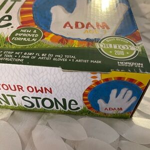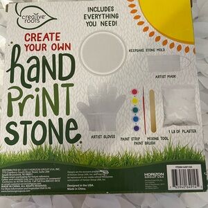 Create your own hand print stone with this kit. Includes plaster mix, paint, and brush. Perfect for a fun DIY project. Kids will love it!