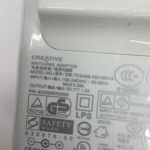 Pre-owned Creative TESA9B-0501800-A switching power adapter with fixed cable and 4mm diameter barrel connector. Rated input is 100–240V~ 50–60Hz 0.28A max, with 5V 1.5A DC output. The adapter is fully functional and shows light cosmetic wear such as minor surface marks from normal use. Sold as the power adapter only.