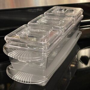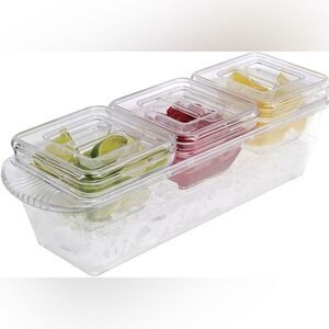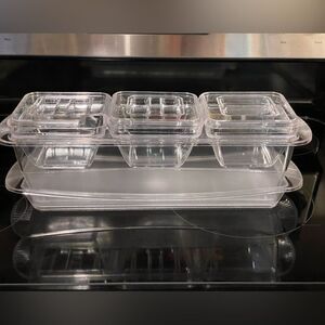 This clear plastic party dish has three square compartments for all of your goodies that need to stay cool for a long period of time. There are so many options for fruit, dips, cheese, sauces etc… The three compartments are held up by another piece, therefore you are able to put ice on the bottom. The bottom piece is used to catch all of the condensation that may accumulate during a period of time. There are some scratches, and the separation piece has a split in it, which is shown in photos. They all have covers, and one has a curved corner cutout. This will be perfect for any kind of party, get together or even holidays. It really is a great functional piece.