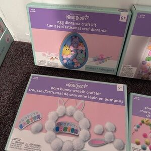 Set of Creatology craft kits including egg diorama, pom bunny wreath, door decor, and chick garland. Features pastel colors.