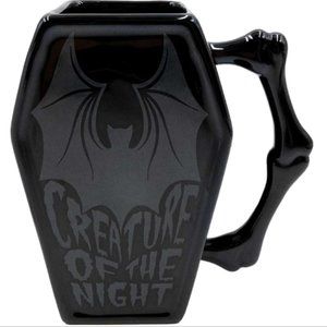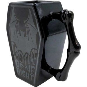New in box! Rise up from the dead with this Creature Of The Night Coffin Mug full of coffee! This large ceramic mug comes in the shape of a coffin to bring your gothic home that vamp appeal. Featuring grey 'Creature of the Night' text with bat silhouette on the face of the mug and bone-shaped handle for an extra vampy touch. Designed to hold 542mL (18.3 FL OZ) of your favorite hot or cold beverages or any necessary items - from makeup brushes to pens and kitchen utensils. Its glossy finish makes it dishwasher, microwave, food, and beverage safe. Approx 6" H (15cm), 5.3" W (13.5cm), 2.75" D (7cm). Designed in California.