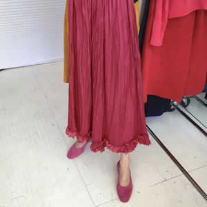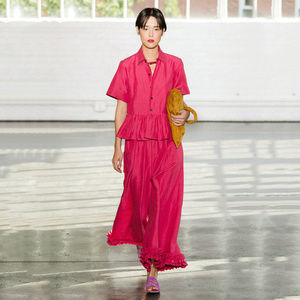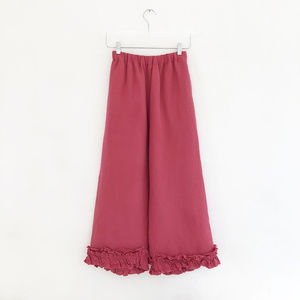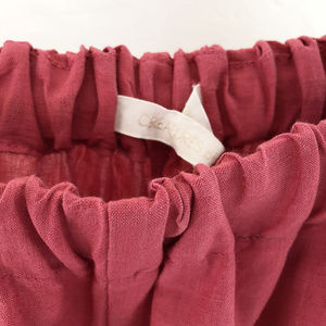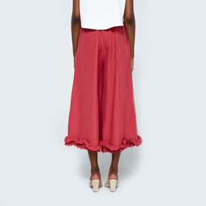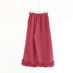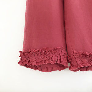 Camelot Pant by Creatures of Comfort in pink. High-waisted, adjustable drawstring waist, wide leg, slightly cropped length, ruffle hem, two side pockets. Loose, relaxed fit. Silk-linen blend. $430 with tax. Sold out.
