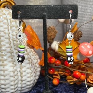 These handmade Halloween earrings feature a glossy black skull charm topped with vibrant candy-colored beads and a dangling spooky eyeball detail β perfect for anyone who loves their spooky season with a side of fun!