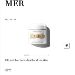 From the website: “This luxuriously rich cream deeply soothes, moisturizes and heals away dryness. Skin looks naturally vibrant, restored to its healthiest center. Miracle Broth™ – the legendary healing elixir that flows through all of La Mer – infuses skin with sea-sourced renewing energies. Ideal for drier skin”