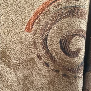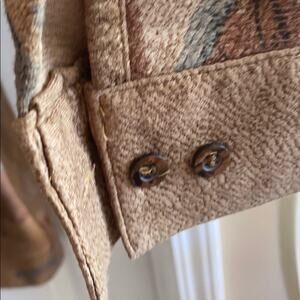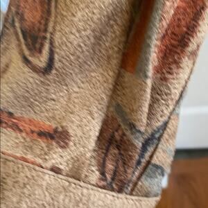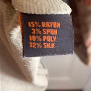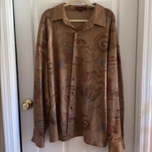 Creme de Silk button down shirt. Button and pleated sleeves. Drop shoulder. Armpit to armpit measures 27 inches. 34 inches long. Lovely print and colors. Soft and warm. Rayon and silk blend. Upscale.