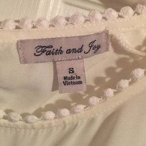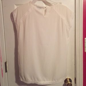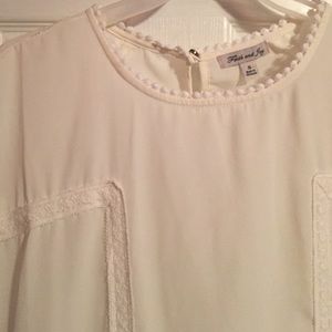 A creme top with lace accents and a small button on the back. This is gently worn and comes from a smoke free home.