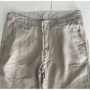 100% linen slacks. Color is lighter brownish tan. Flat front, "Nantucket" style. Good used condition. Our listings are all things we have purchased new, so we have first hand knowledge of how much it was used and any issues. Since we tend to compulsive shop, we are constantly purging closets to make room for new things. All our items are from a smoke free home.