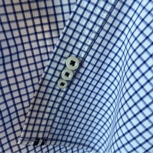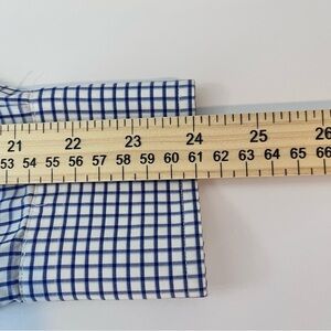 Classic blue and white plaid, long sleeves, collared neckline with button-down collar and button closure. The front has a blue and white trim along the button front.