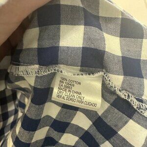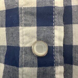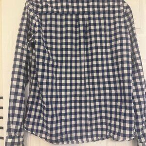 Women's blue and white plaid gingham Cremieux snap down long sleeve shirt with pearl-like snap closures.