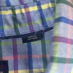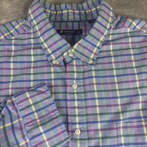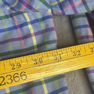 Features a classic button-down collar, single front pocket, button cuffs, and a colorful plaid pattern in blue, green, yellow, and hints of pink