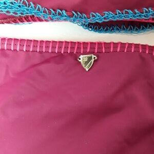 Cremieux deep red bikini set with me on embroidered trim, cold shoulder top with optional halter strap. Size large. Brand new with tags. Retail $104.