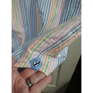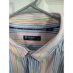Cremieux men's candy striped short sleeve Oxford collared button shirt in excellent condition. Relaxed casual fit front pocket white blue pink green orange