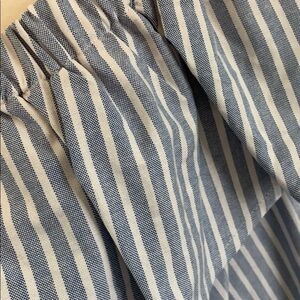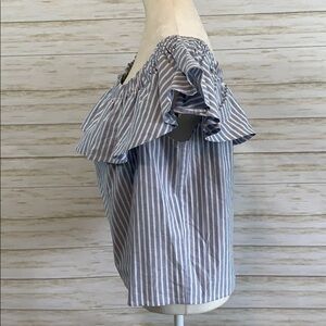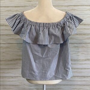 Cremieux off the shoulder top. 100% cotton blue and white ticking fabric. Elastic all the way around neckline. Due to the mannequin not having arms, the top is sitting on shoulders, but it is made to rest on the upper arms. Full ruffle neckline. Women’s size Large. Great used condition.