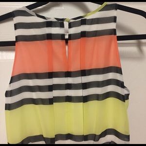 This beautiful Cremieux maxi dress is perfect for spring and summer! The bright coral, yellow, white, and black stripes are sure to pop at brunch, church, or a night out! The fabric is chiffon and it does have a liner that goes to the knee. Only worn once. The size is xs, but fits like a small-medium.