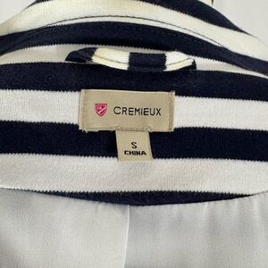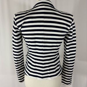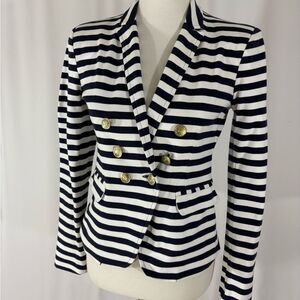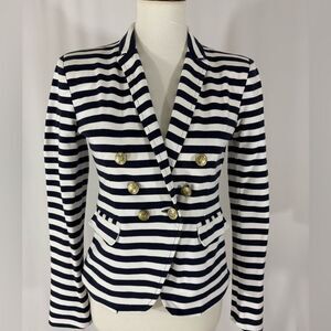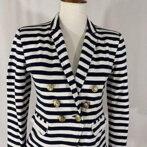 Stylish navy and white striped blazer. Features double-breasted design with gold buttons. Perfect for a polished look.