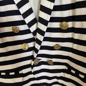 Super cute preowned blazer by Cremieux! True navy, almost black and white stripes and gold buttons. Nice and comfortable, lots of stretch!