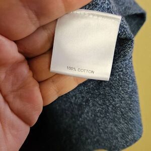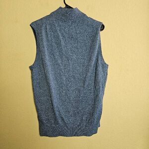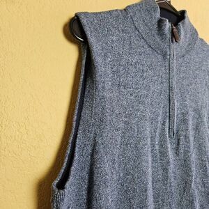 This is a blue sweater vest by Cremieux. It has a half zipper on the chest, and the zipper pull features the name brand.