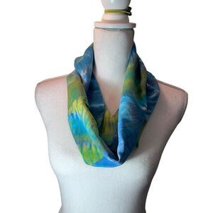 Crepe Silk Green and Blue Tie Dye Infinity scarf. Lovely lightweight double layered scarf in multi tonal blues and greens. In excellent condition .