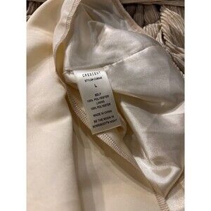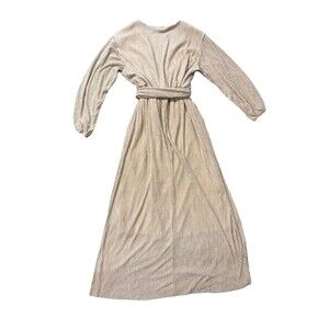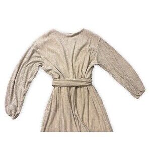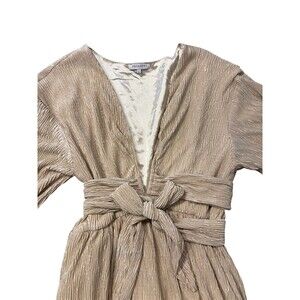 Beautiful Crescent maxi dress in a shimmering gold tone, perfect for the holiday season, wedding guest or any special occasion. This lined dress features a flattering deep V neckline, long sleeves, and an attached bow wrap to accent the waist. The fabric has a crinkle-style texture that gives it an elegant, flowing look. Preowned and gently worn, in great condition with no major flaws. Womens size large.