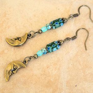 Each earrings has a 10mm x 19mm antiqued bronze tone pewter moon charm, a green Millefiori rectangle bead, a blue Picasso seed bead, a Czech sea green Fire polish bead, suspended from an antiqued bronze plated brass fish hook, light weight ear wires.