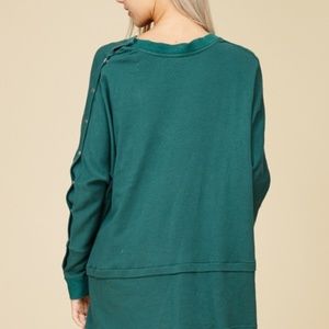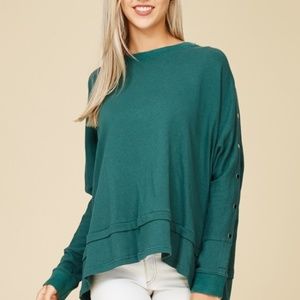 Sweatshirt material gone chic! The button accent up the arms are functioning, and can be opened to give you the off the shoulder look!