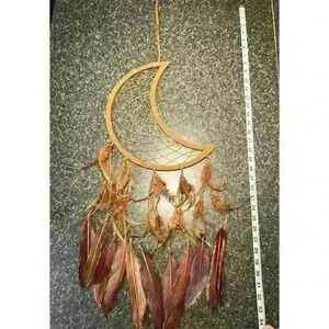 Crescent Moon Dream Catcher Brown Suede Feathers & Beads 34" Long