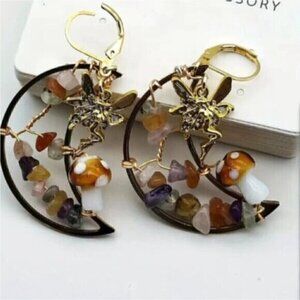 Crescent Moon Gold Mushroom Colorful Stone Fairycore Earrings