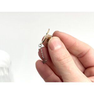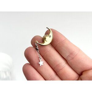 Lovely little gold toned crescent moon vintage lapel pin. The moon has a little smile. Hanging from the bottom of the moon are silver toned stars. The enclosure is via push back.